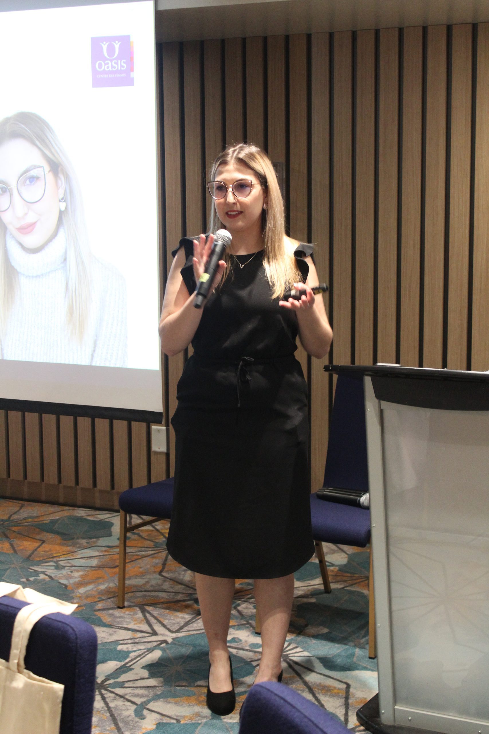 Photo : Le 8 mars, l’influenceuse et féministe engagée Anne-Marie Gagné a donné une conférence à Toronto pour Oasis Centre des femmes. (Crédit : Le Métropolitain)
